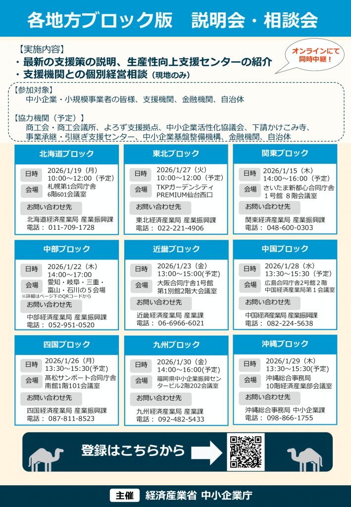 本キャラバンでは最新の賃上げに関する施策の説明とともに、各地域における説明会では支援機関との個別経営相談会も併催される予定です。